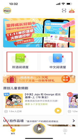 1、首頁提供雙語中文閱讀屋入口,含原創兒童音頻劇內容,支持閱讀年卡購買,是語言學習與閱讀資源的展示頁。