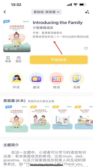 2、閱讀詳情頁按主題分類內容,提供伴讀跟讀等功能,配套紙質繪本資源,助力兒童系統學習語言知識點。