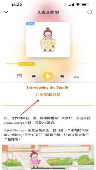 3、音頻劇播放頁展示兒童音頻劇內容,支持播放暫停等操作,以故事形式呈現內容,提升學習趣味性與沉浸感。