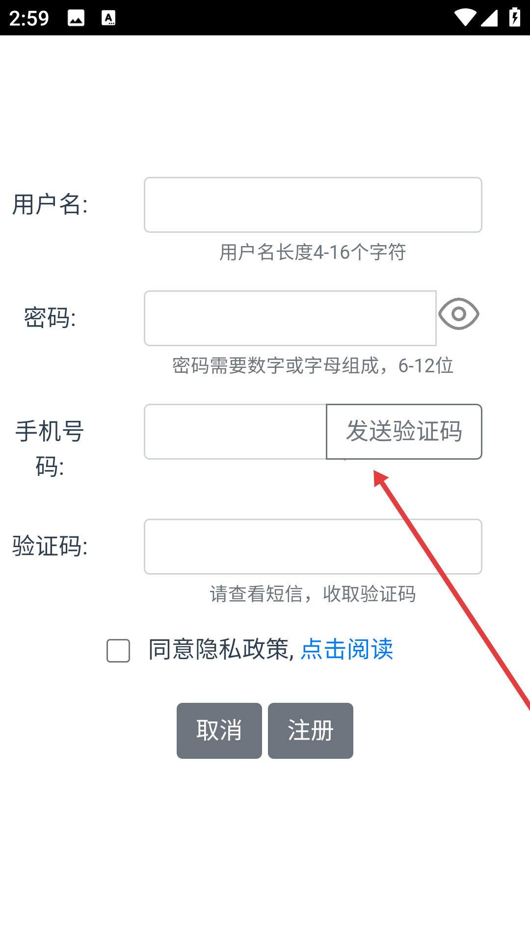 3、在搖旗店鋪的注冊頁面,需依次填寫用戶名、密碼和手機號,點擊發送驗證碼并填寫,勾選同意隱私政策后,點擊注冊完成注冊。