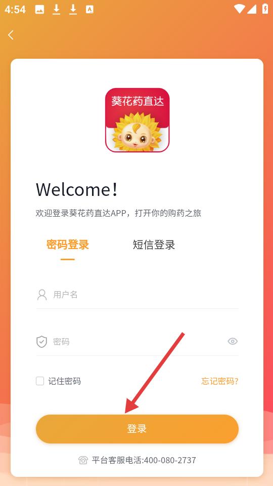 1、點擊登錄界面,提供密碼和短信登錄方式,輸入用戶名、密碼,點擊登錄開啟購藥之旅,有客服電話。
