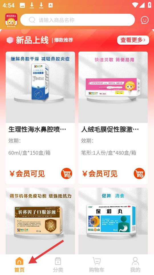 2、點擊首頁設新品上線與爆款推薦,展示多款藥品,如緩解鼻腔問題的噴霧等,價格對會員可見,功能欄豐富。