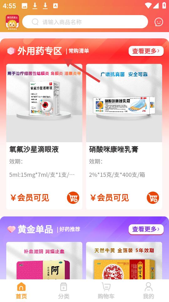3、點擊外用藥專區呈現多種外用藥,如治療眼部炎癥的滴眼液等,另有黃金單品推薦,方便用戶選購外用藥品。