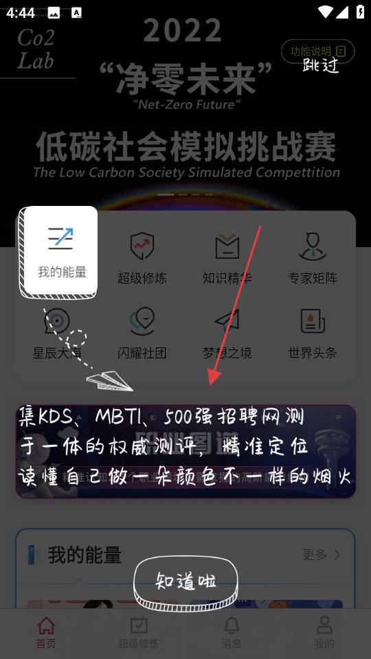 1、打開完美大學APP,在首頁查看低碳社會模擬挑戰賽等活動及功能引導,點擊知道啦,進入后續操作界面。