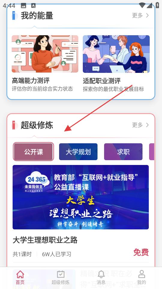 2、切換到我的能量頁面,瀏覽超級修煉板塊,選擇公開課、大學規劃等分類,查看對應課程資源,參與學習。