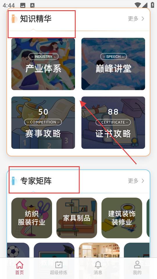 3、在首頁找到知識精華與專家矩陣板塊,點擊更多,查看產業體系、專家指導等內容,獲取學習與就業助力。