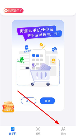 1、進入川川云手機首頁,可見海量云手機的宣傳內容,底部有云手機發現我的選項,點擊我的,進入個人中心頁面。