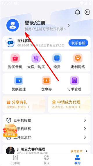 2、進入個人中心頁面,能看到登錄、注冊入口及在線客服購買云機等功能,點擊登錄、注冊,進入對應的操作界面。