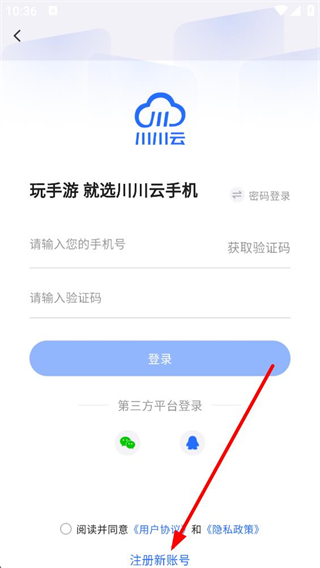 3、進入登錄界面,可輸入手機號獲取驗證碼完成登錄,也能點擊注冊新賬號,進入快速注冊的操作頁面。