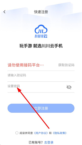 4、進入快速注冊頁面,需填寫手機號獲取驗證碼,設置密碼,勾選相關協議后,點擊立即注冊,完成賬號注冊操作。