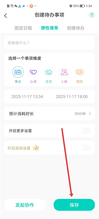 1、進入創建待辦事項頁面,選擇彈性清單分類,填寫待辦內容,選定事項維度如事業心靈等,設置時間及預計耗時,完成后點擊保存即可創建待辦。