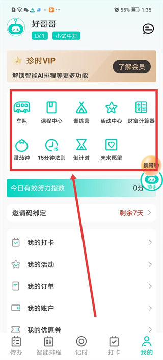 智能排程、目標設定、高效復盤、自律打卡、番茄鐘工具。