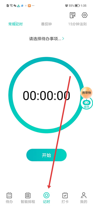 2、切換到記時板塊選擇對應待辦事項,點擊開始按鈕啟動計時,可使用常規記時番茄鐘等模式,輔助記錄待辦事項的實際耗時情況。