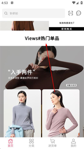 2、注冊后進入首頁可看到熱門單品區域和各類服裝推薦,點擊感興趣的熱門單品,如桑蠶絲發熱羅紋加絨打底衫,進入商品詳情頁面。