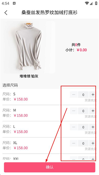 4、在規格選擇頁面選擇合適的尺碼,如S、M等,點擊確認,完成商品規格選擇。