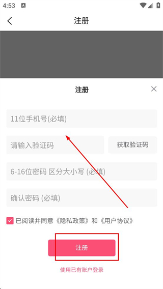1、打開超凡云倉APP,進入注冊頁面,勾選已閱讀并同意隱私政策和用戶協議,點擊注冊,完成賬號注冊。