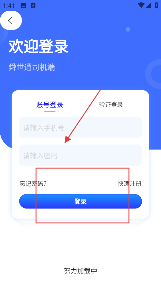 1、打開舜世通司機端APP,進入歡迎登錄頁,選擇賬號登錄,輸入手機號、密碼,點擊登錄,進入系統 。