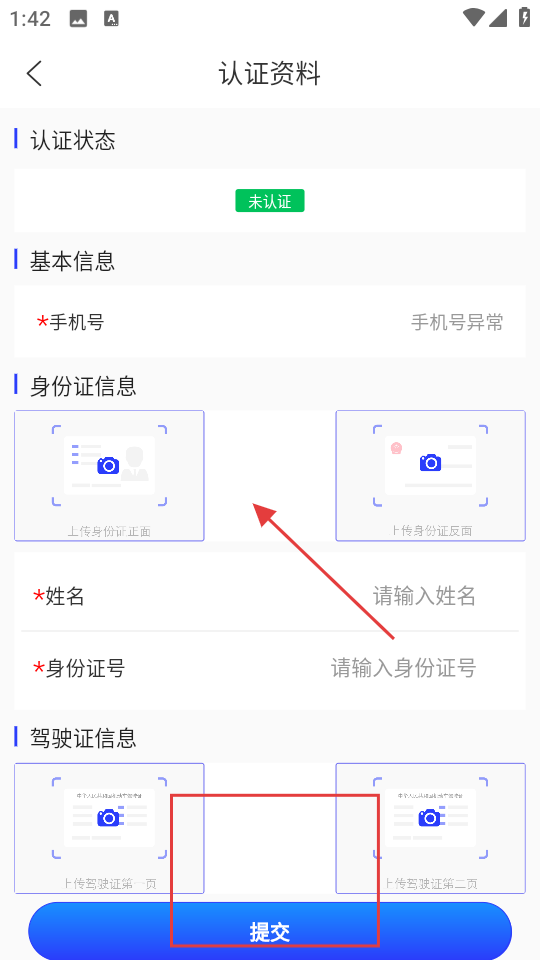3、進入認證資料頁,查看認證狀態,填寫手機號、姓名等基本信息,上傳身份證、駕駛證照片,點擊提交,完成認證。