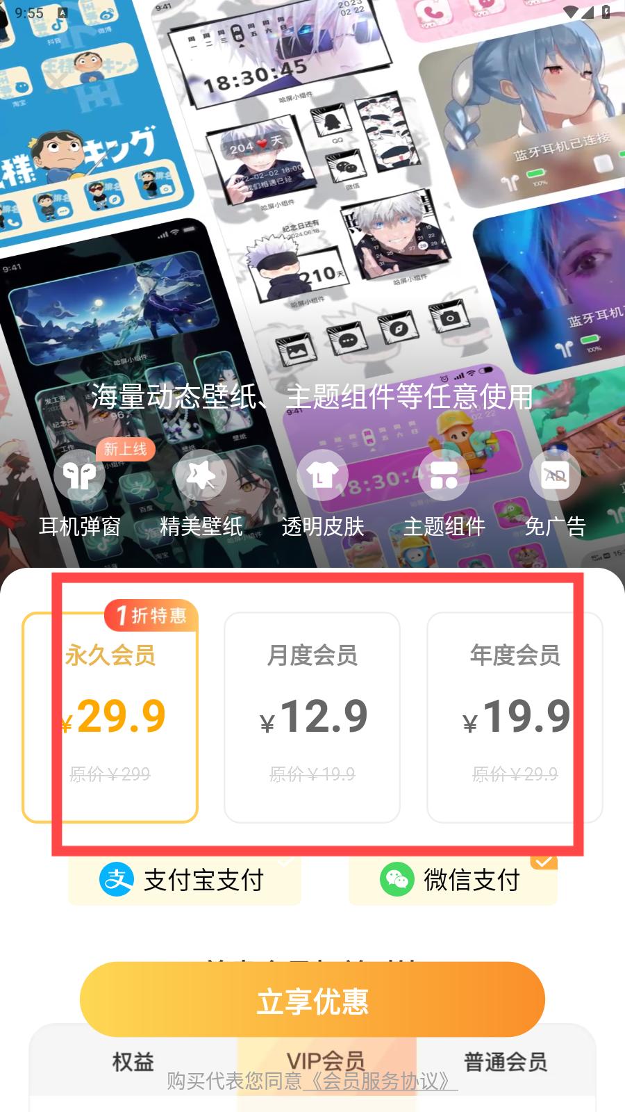 1、手機美化愛好者看過來,壁紙應用會員優惠大放送,暢享海量資源,全年超值體驗。動態壁紙、主題組件隨心用,還能免廣告,別錯過。