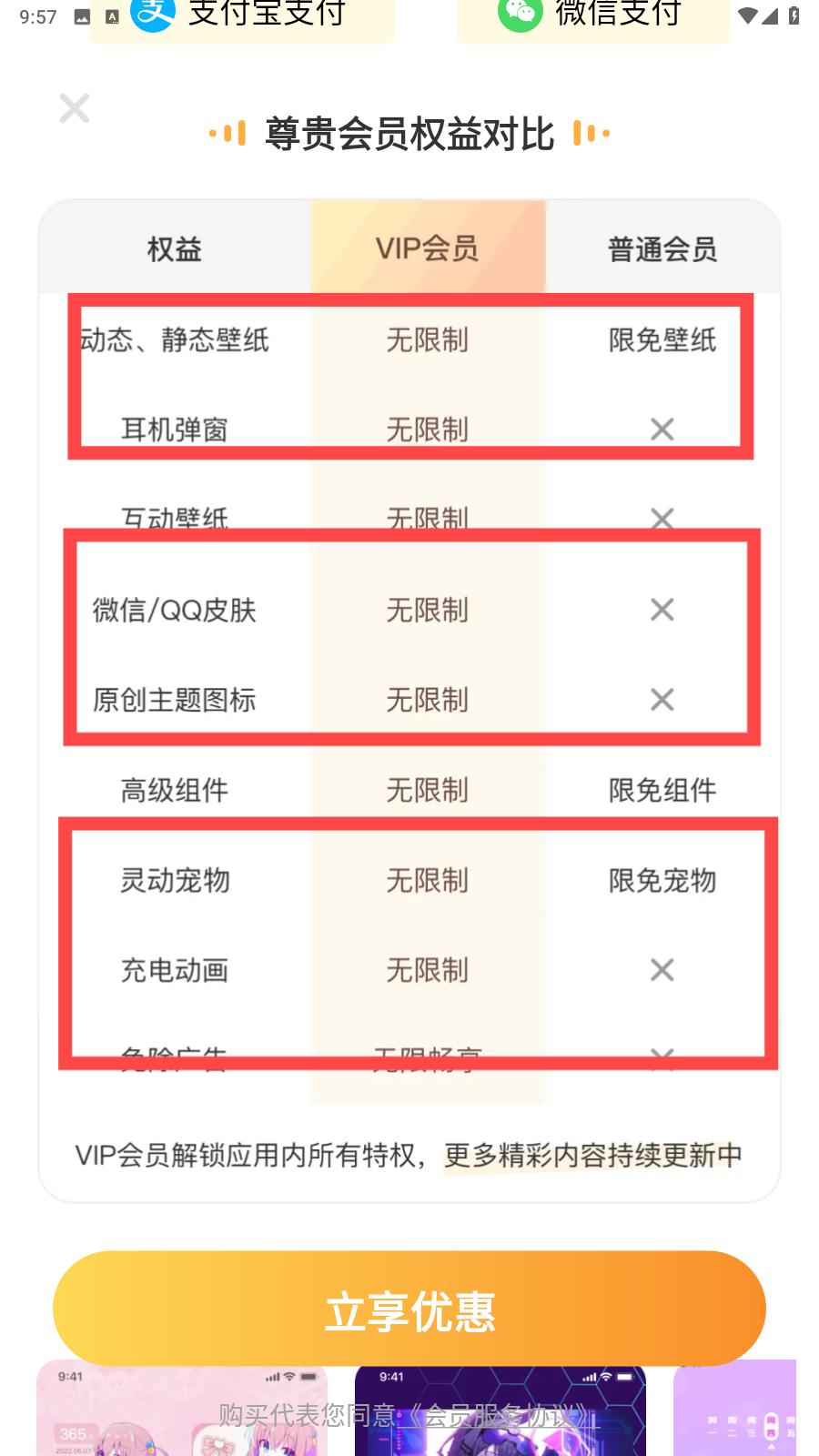 2、在手機美化的世界里,會員權益決定著體驗的豐富程度。此圖展示了哈屏壁紙應用中 VIP 會員與普通會員的權益差異。