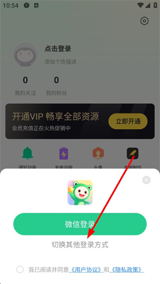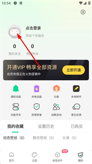 2、進入我的界面后,顯示點擊登錄狀態,含開通VIP通知動畫等功能選項,點擊頭像區域,可觸發登錄選項的彈窗界面。