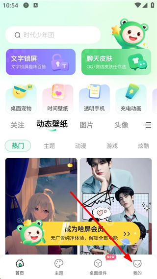 1、進入應用首頁,可見搜索欄及文字鎖屏聊天皮膚等功能入口,還有動態壁紙等板塊,點擊底部我的按鈕,可進入對應的個人界面。
