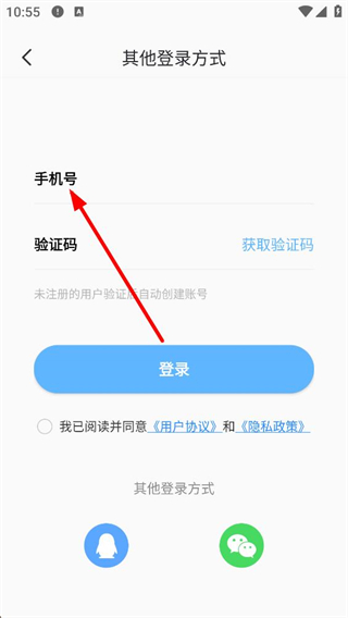 4、進入其他登錄方式頁面后,可填寫手機號獲取驗證碼登錄,也能選擇QQ等賬號登錄方式,完成賬號的登錄操作。