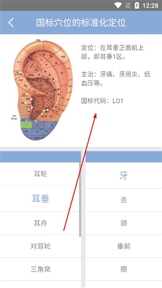 4、滑動頁面查看耳垂區域對應的牙穴位,了解其定位在耳重正面前上部,以及主治牙痛等病癥的內容。