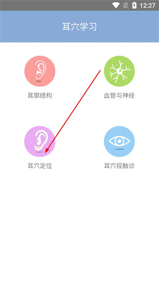 1、打開妙郎中耳穴檢測軟件,進入耳穴學習頁面選擇耳穴定位選項,進入耳穴定位與功能的內容列表。