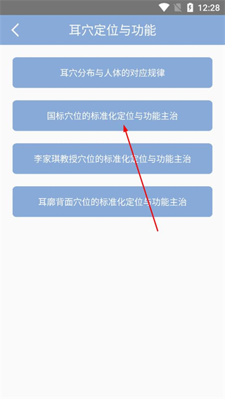 2、在內容列表中選擇國標穴位的標準化定位與功能主治選項,進入該主題的詳細學習頁面。