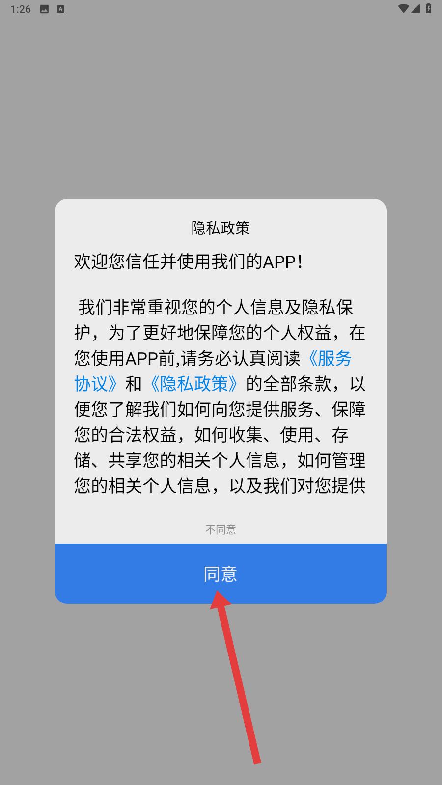 1、點擊隱私政策彈窗里的同意按鈕,確認接受協議內容,關閉彈窗,進入應用首頁。