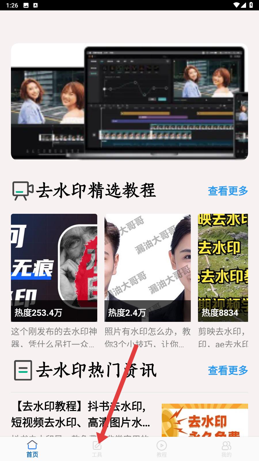 2、在首頁底部導航欄中找到標注為工具的選項并點擊,此操作會跳轉至工具頁面,該頁面包含視頻處理工具等板塊,為后續選擇視頻處理功能做準備。