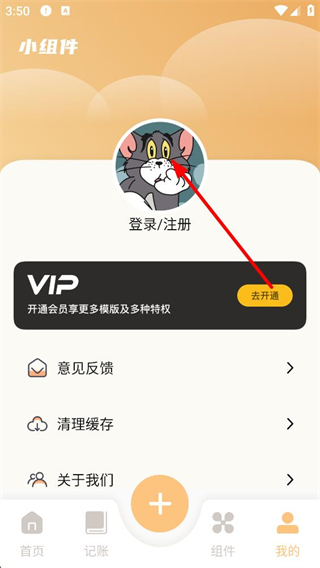 2、進入我的頁面,可見登錄、注冊入口,還有開通VIP享更多模板及特權的提示,同時配備意見反饋清理緩存關于我們等功能選項供操作。