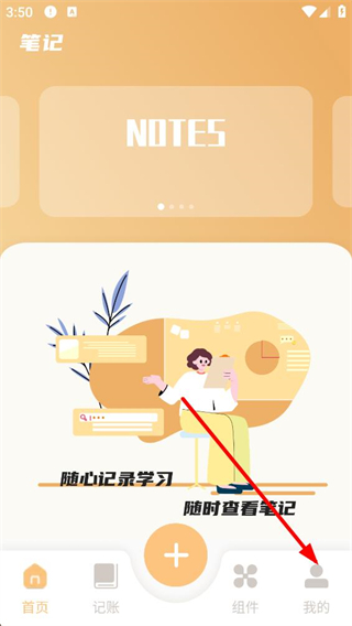 1、進入該筆記應用首頁,可看到隨心記錄學習隨時查看筆記的宣傳內容,界面底部配備首頁記賬組件我的等功能入口,點擊我的可進入個人相關操作頁面。