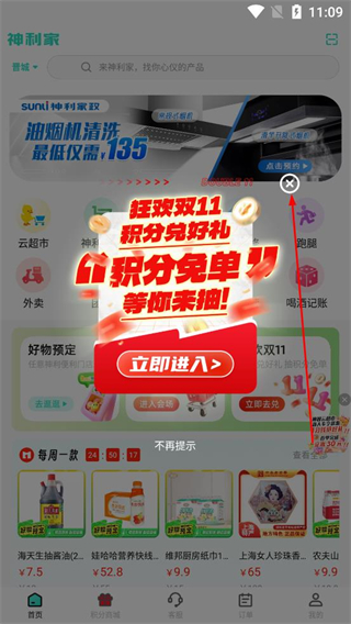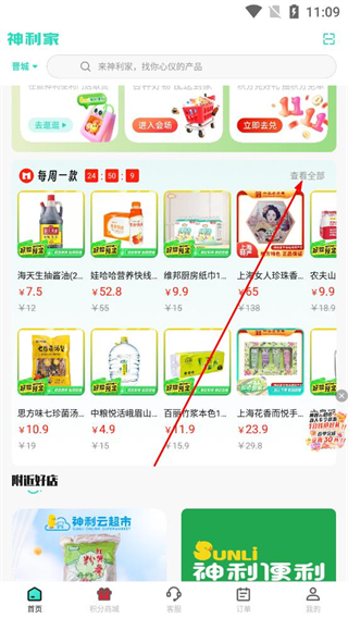 3、登錄后進入首頁關閉彈窗后可看到云超市、外賣等板塊,還有各類商品推薦,點擊每周一款的查看全部,進入每周一款商品頁面。