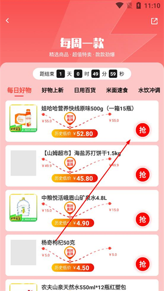 4、在每周一款商品頁面選擇感興趣的商品,如娃哈哈營養快線原味,點擊搶,進入商品搶購頁面。