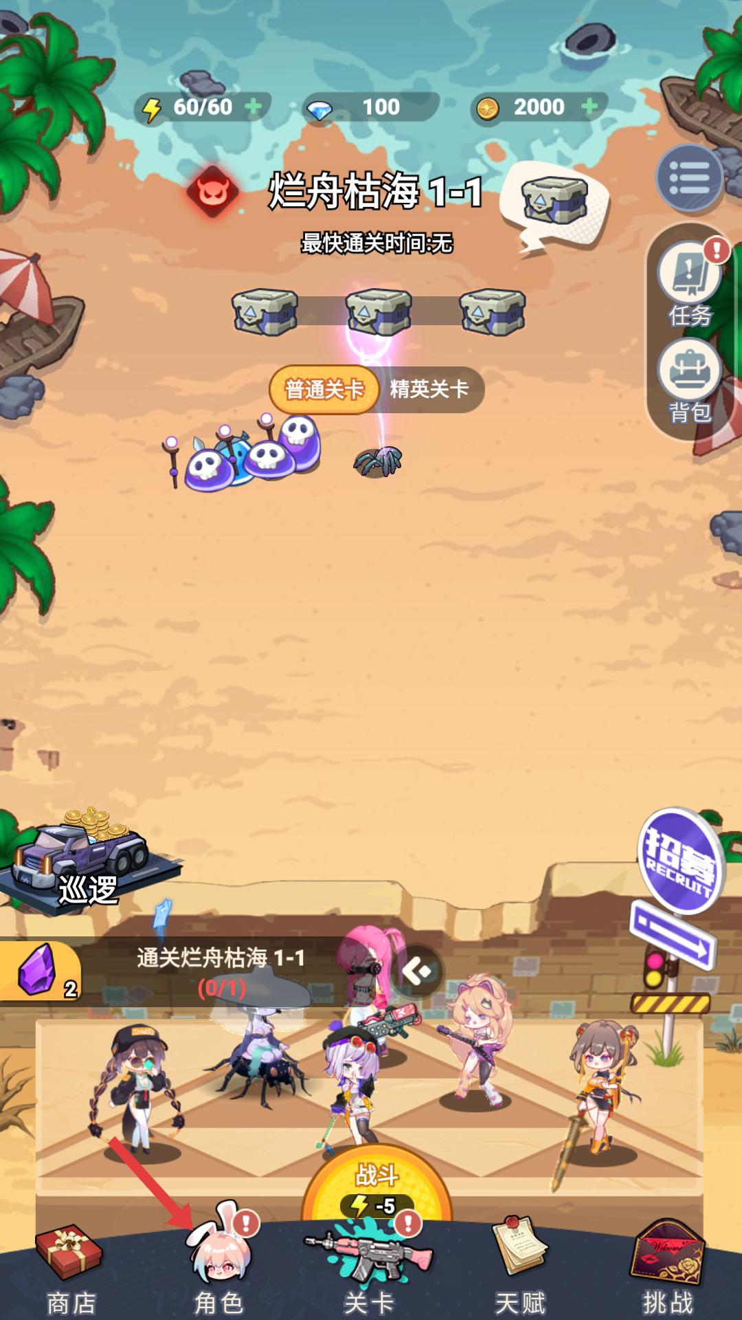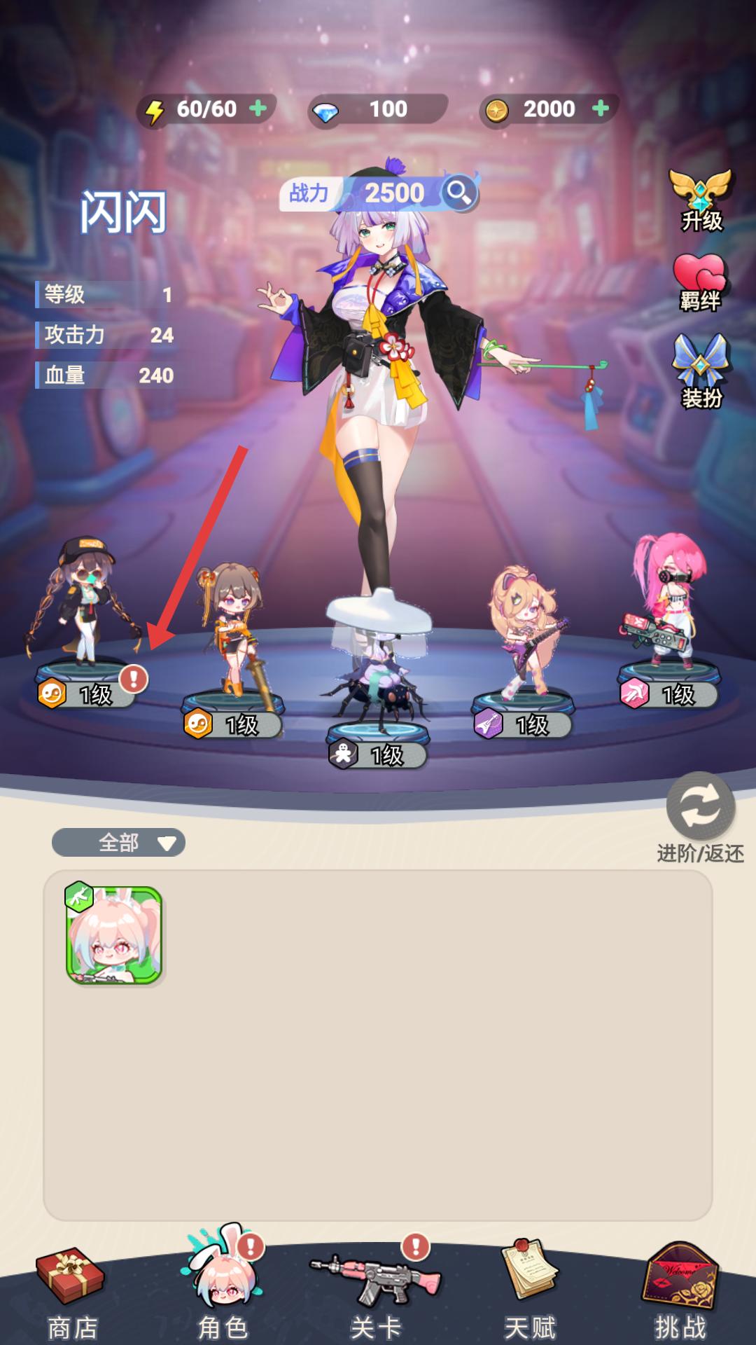 2、進入游戲后,在關卡選擇等界面,點擊下方【角色】選項,可進入角色相關界面,查看已擁有的角色。