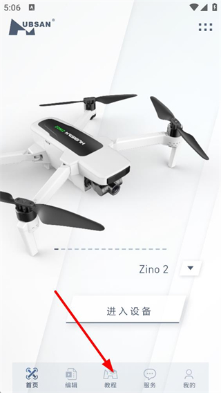 1、進入哈博森無人機App首頁,可見Zino2無人機展示界面,點擊底部教程按鈕,進入包含教學內容的教程頁面。