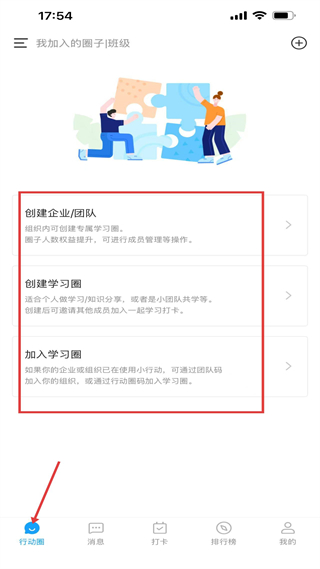 2、行動圈界面,可創建企業團隊、個人學習圈,也能加入已有學習圈,滿足個人和組織學習打卡、知識分享需求。