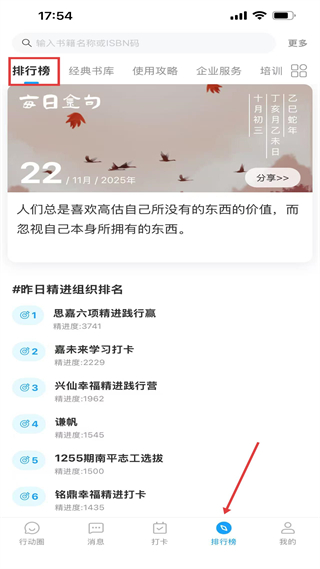 3、排行榜界面,展示精進組織排名,還有經典書庫、使用攻略等板塊,為用戶提供學習資源和競爭動力。