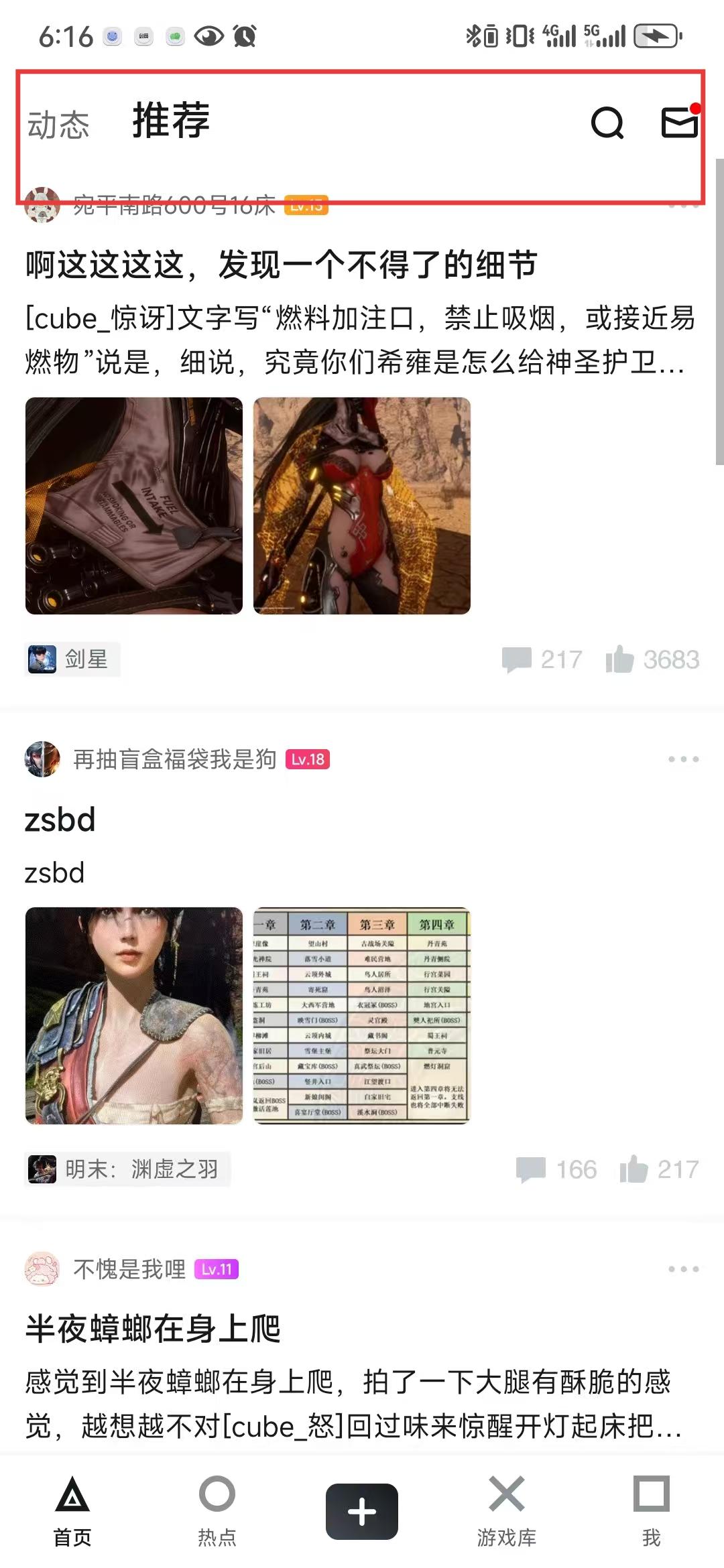 1、打開APP首先進入首頁,首頁頂部有動態和推薦兩個選項卡,可切換查看不同內容,你可以瀏覽這些動態和推薦內容,了解游戲相關資訊、玩家分享等。