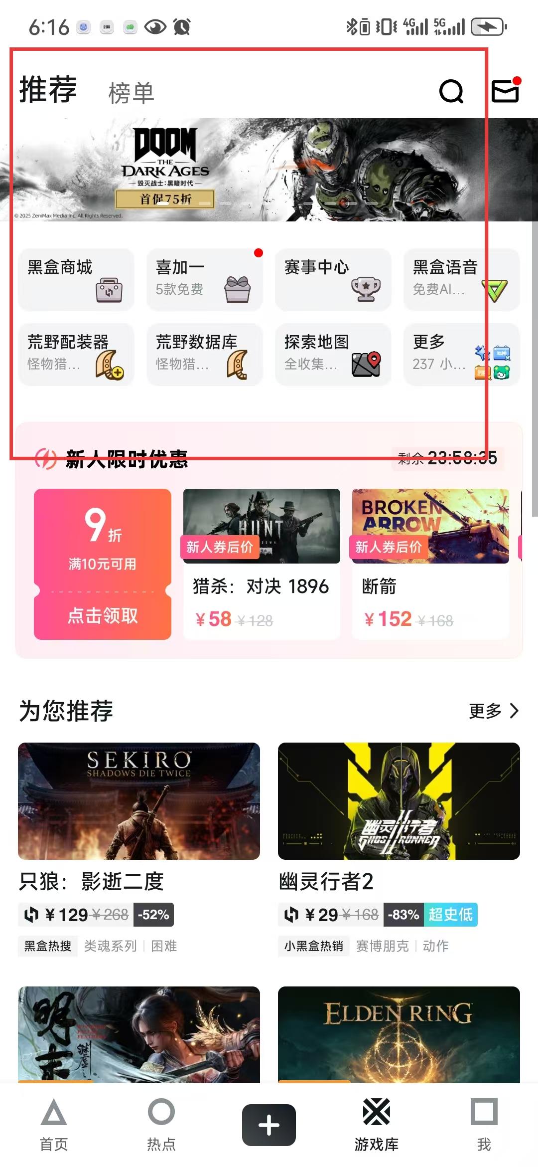 3、點擊底部導航欄的游戲庫選項進入游戲庫頁面,頂部有推薦和榜單選項卡,可查看推薦游戲和各類游戲榜單,頁面還設有黑盒商城等功能入口,滿足你的游戲需求。