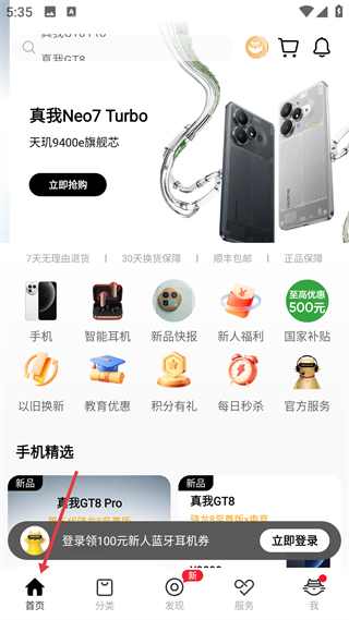 1、首頁,展示真我Neo7 Turbo及配置,有搶購入口和售后保障,含各類服務入口,可快速了解產品與福利。