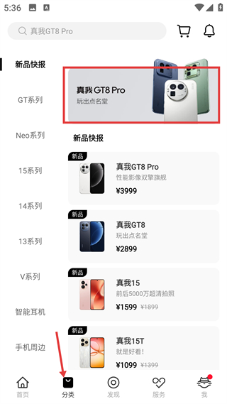 2、分類頁,按系列劃分產品,展示真我GT8 Pro等新品價格,清晰呈現機型定位,便于按系列篩選心儀產品。