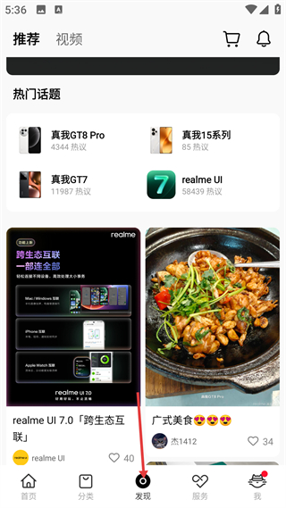 3、發現頁,含熱門話題和系統功能介紹,還有用戶分享內容,兼具資訊瀏覽與社區互動的功能。