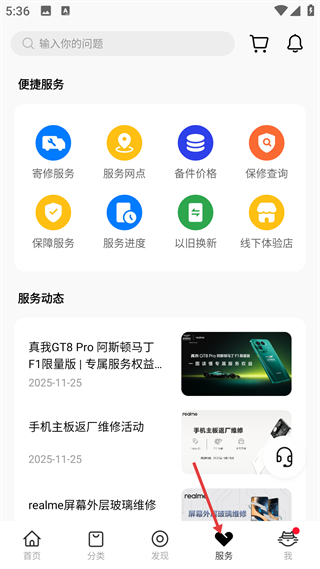 4、服務頁,提供寄修等便捷服務,展示服務動態,涵蓋售后與活動信息,助力解決設備相關問題。