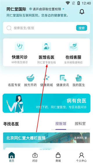 3、注冊即進入APP的首頁界面,頂部有位置權限提示、搜索欄設有快速問診、醫館名醫等功能區,還有名醫專家、按方開藥等服務入口,中間病有良醫板塊推廣名醫問診。