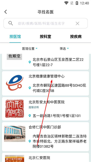 3、在尋找名醫頁面的按醫館分類下選擇目標醫館如北京植康健康管理中心,點擊進入該醫館的詳情頁面。