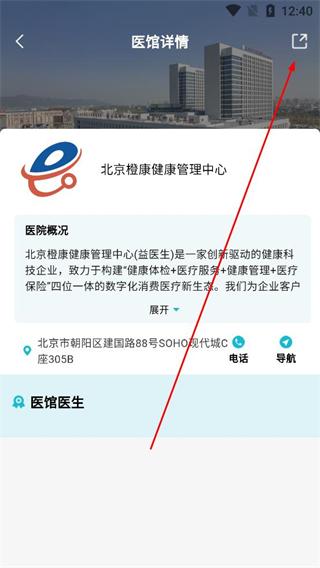 4、在醫館詳情頁查看醫院概況地址等信息,可點擊電話聯系或導航前往,點擊分享按鈕可以分享給朋友。