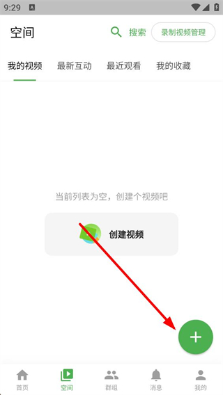 2、進入空間頁面后,看到我視頻列表為空,點擊右下角的加號按鈕,彈出包含錄制等操作的選項菜單。